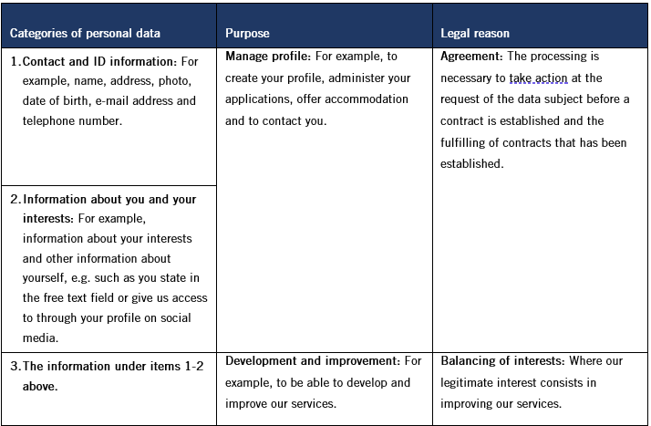 Below are the categories of personal data that we process in connection with an application for a shared apartment, for what purposes we process the personal data and for what legal reason.
